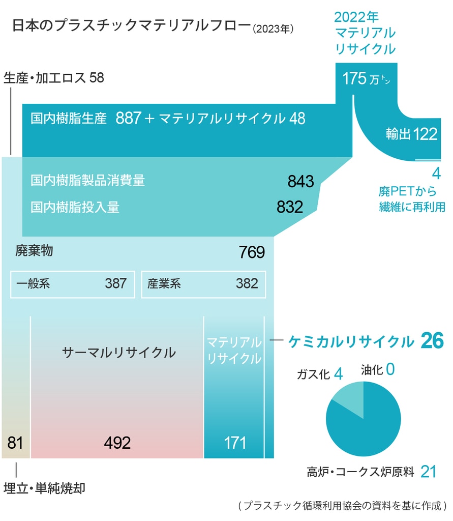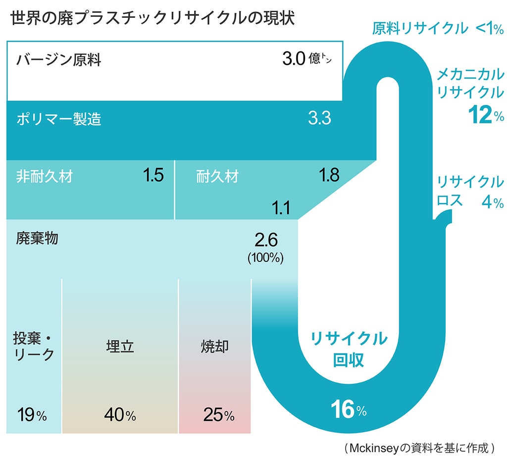 世界のプラスチック需要は増加し続けている。50年には累計260億トンの廃プラスチックが発生する試算がある。しかし、現状リサイクル回収されているプラスチックは16%で、そのほとんどがマテリアルリサイクル(MR)である(サーマルリサイクルは世界的にはリサイクルに含まれない)。MRはCO2排出が少ない技術だが、プラスチックの種類に制限があったり、繰り返し再生することで品質が低下したりする課題がある。