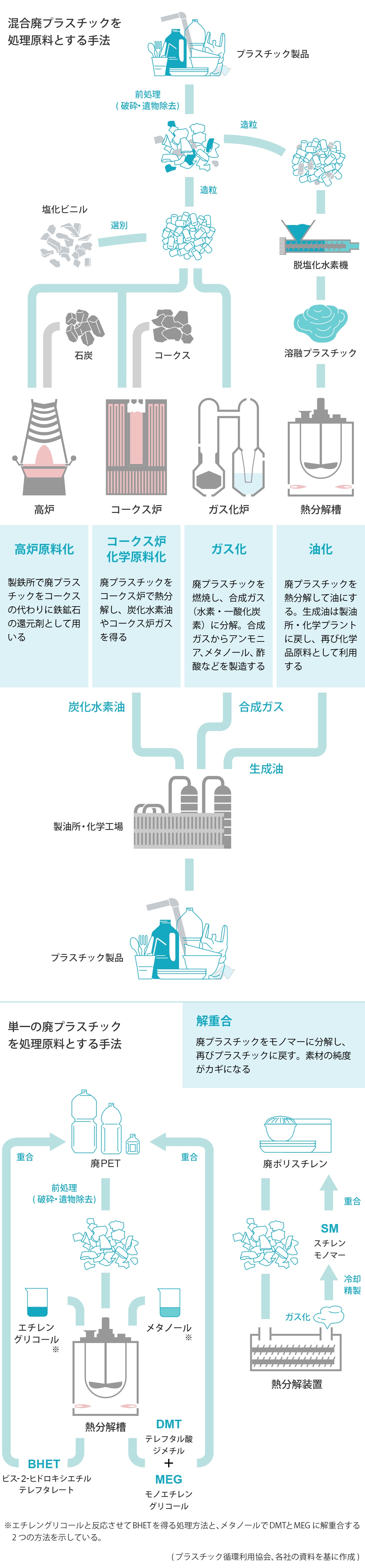 一方、CRは何度でもバージン品と遜色ない製品を再生できることから、サーキュラーエコノミーの観点から注目されている。単一のプラスチックだけでなく、混合プラや複合プラもまとめて処理できる手法もある。高炉原料化、コークス炉化学原料化、ガス化、油化、解重合が代表的な技術で、国内では高炉原料化とコークス炉化学原料化が大半を占めている。