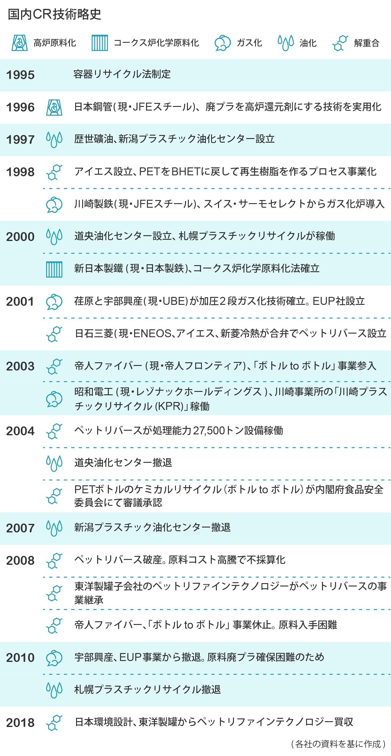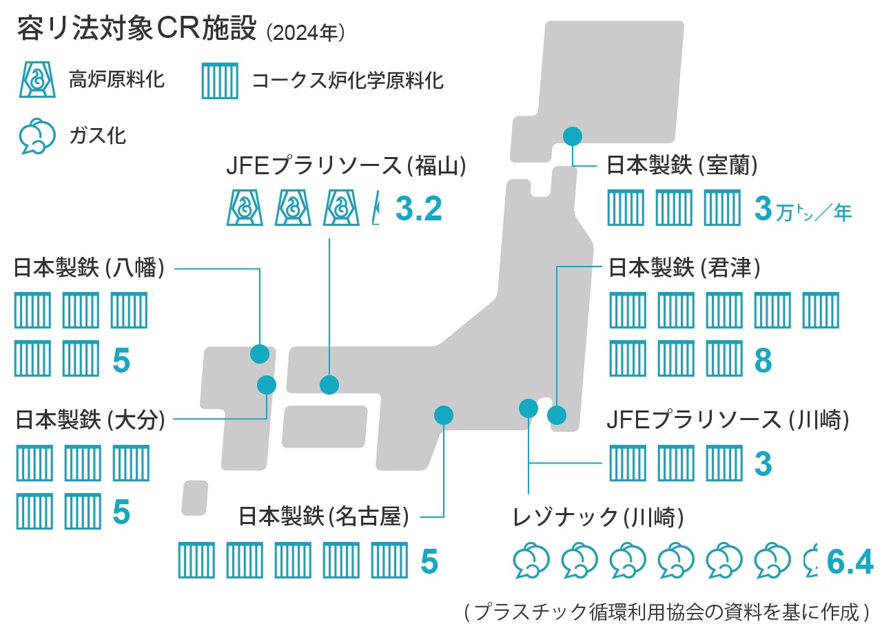 CR技術の開発は、1980年代後半の廃プラスチックによる環境汚染問題の深刻化から省エネ・省資源の機運の高まりを受けて始まった。96年に日本鋼管(現・JFEスチール)が高炉法を、00年に新日本製鐵(現・日本製鉄)がコークス炉法を確立。ガス化法では荏原と宇部興産(現・UBE)や昭和電工(現・レゾナック・ホールディングス)が先鞭をつけ、解重合法はPETをモノマーに戻す技術が開発された。油化法は東芝系の札幌プラスチックリサイクルなどが事業化したが、採算性や技術的な課題があり、すべて撤退している。