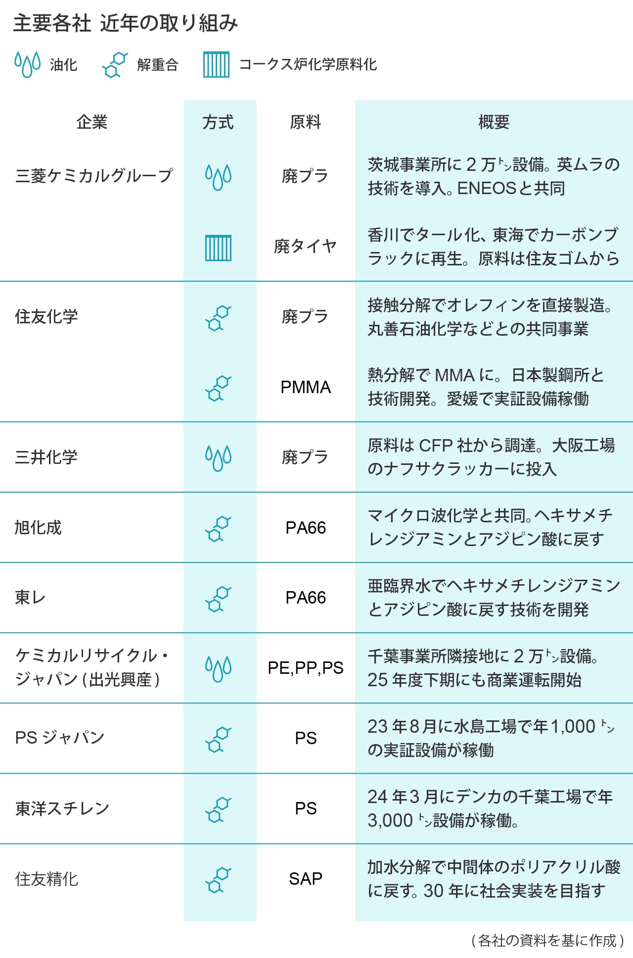 マッキンゼーは、世界の再生プラビジネスが30年に16年比1.5倍の6.6兆円まで成長し、再生プラの内訳で最も多いものが熱分解と予測している。日本化学工業協会は国内の廃プラ年間処理量のうち、CRを30年に150万トン、50年に250万トンとする「あるべき姿」を公表している。