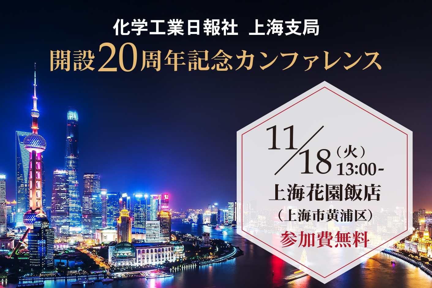 この度化学工業日報社は、日ごろお世話なっております皆さまをお招きし、11月18 日(火) に「上海支局 20 周年記念カンファレンス」を開催します。