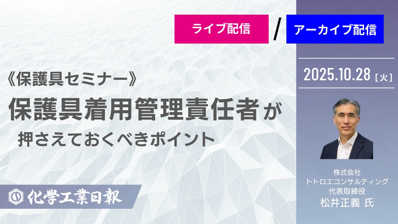 ※本セミナーは化学工業日報社が企画するセミナーであり、厚生労働省の定める「保護具着用管理責任者教育カリキュラム」に則ったものではございません。修了証等は発行いたしません。