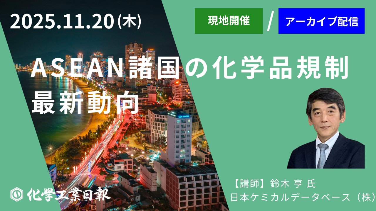 本セミナーではASEAN 諸国の化学品規制について、最新動向をご案内します。多数の関係者のご参加をお待ちしております。
